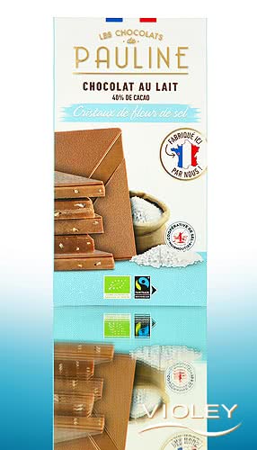 Les Chocolats de Pauline Milchschokolade 40% Fleur de Sel. Genießen Sie das Zusammenspiel der Aromen von zart schmelzender Vollmilchschokolade und einem Hauch von Meersalz. Die zarten Salzkristalle des feinem Fleur de Sel stammen aus den traditionellen Salzgärten von Noirmoutier, einer Insel im Atlantischen Ozean. Die Chocolatiers der französischen Marke Les Chocolats de Pauline produzieren in der Gemeinde Montréverd im Département Vendée feine, köstliche Schokoladen.