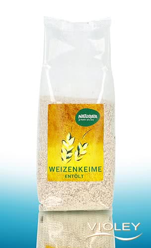 Naturata Weizenkeime teilentölt. Der Weizenkeim ist der Teil des Weizenkorns, aus dem sich eine neue Pflanze entwickelt. Der durch die Getreidevermahlung als Plättchen anfallende Weizenkeim wird teilentölt und sofort verpackt. Als Zugabe in warme und kalte Speisen, wie zum Beispiel Müsli, Joghurt, Salat oder Suppen.