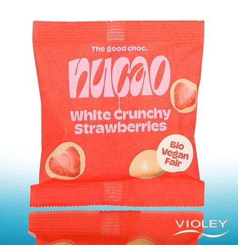 Nucao White Crunchy Strawberries. Gefriergetrocknete Bio-Erdbeeren umhüllt von einem veganen, cremigen, hellen Überzeug mit Kakaobutter und Cashewmus. Klingt nicht nur fruchtig, ist es auch! Ein Snackerlebnis für unterwegs, das Büro oder einfach auf der Couch.