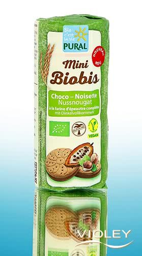 Pural Mini Biobis Choco Nussnougat. Knusprige Dinkelkekse gebacken mit Vollkorndinkelmehl und einer cremigen Nussnougatfüllung aus Haselnüssen und Kakao. Diese kleinen Doppelkekse sind ein Genuss für die ganze Familie und kommen ganz ohne Palmöl aus.