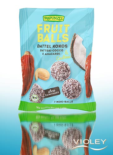 Rapunzel Fruit Balls Dattel Kokos & Cashew. Dieser kugelrunde Snack besteht nur aus drei Zutaten: Datteln, Cashewkerne und Kokosraspeln. Ohne Zusatz von Zucker¹. Ursprünglicher Genuss für die Pause, unterwegs oder einfach so zwischendurch.