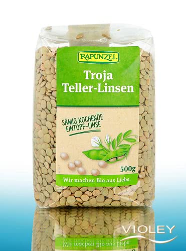 Rapunzel Troja Teller-Linsen. Die sämig kochenden Linsen zeichnen sich durch ihr kräftig würziges Aroma aus. Für Eintöpfe, Suppen und Aufläufe, als Beilage sowie für Saucen oder Pürees.