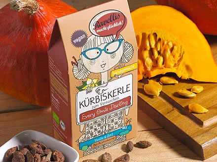 Die lustig-bunten Kürbiskerle von Ravellis sind einfach lecker. Durch die Veredelung gerösteter Bio-Kürbiskerne wird der nussige Eigengeschmack der Kürbiskerne gekonnt hervorgehoben. Die Kürbiskerle „Joghurt-Schokolade & Zitrone“ verbreiten den Spirit von kalifornischem Sommer: Weiße Schokolade, Joghurt und Zitronenöl umhüllen geröstete Kürbiskerne auf elegante Weise. Bevorzugen Sie dunkle Schokolade? Dann sollten Sie die Kürbiskerle in den Sorten „Dunkle Schokolade & Fleur de Sel“ oder „Dunkle Schokolade & Kokos“ probieren. Ganz ohne Schokolade kommen dagegen die Varianten „Vanille & Zimt“ und „Ingwer-Karamell“ aus. Feinster Rohrohrzucker wird mit lieblicher Vanille und Zimt vermengt oder als knackiges Karamell durch eine belebende Ingwer-Note abgerundet. Mit den einfallsreichen Kombinationen der Kürbiskerle von Ravellis erleben Sie feine Röstaromen, nussigen Eigengeschmack und wundervolle Veredelungen. Für kürbisstarken Genuss!