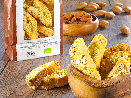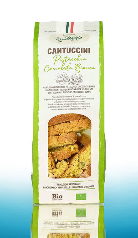 RomiMarie Cantuccini Mandel sind herrlich knusprig und überzeugen mit dem wunderbaren klassischen Mandelaroma. Genießen sie die Keks-Köstlichkeiten zu einem Gläschen Vin Santo oder tunken Sie diese in den Milchschaum von Cappuccino. Während in den Cantuccini Haselnuss Aprikose knackige Haselnüsse und süße Aprikosen statt Mandeln verbacken wurden, wird bei den Cantuccini Mandel Kandierte Orange das typische Aroma der Cantuccini von der mediterranen Süße kandierter Orangen begleitet. Die herzhaft-süßen Cantuccini Mandel Zartbitterschokolade sind ideale Begleiter für eine große Tasse Cappuccino oder Latte Macchiato. Die Cantuccini Pistazie Weisse Schokolade überraschen den Gaumen mit dem Hochgenuss von zart schmelzender weißer Schokolade und gerösteten Pistazienkernen. Erleben Sie mit den RomiMarie Cantuccino einen Vorgeschmack auf Ihren nächsten Italienurlaub.