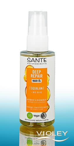 Sante Deep Repair Haar Öl Squalan. Die Pflegeformel mit Squalan und Bio-Olive pflegt das Haar bis in die Spitzen und unterstützt den Schutz vor Haarbruch und Spliss. Bio-Olive ist reich an Nährstoffen, schenkt Geschmeidigkeit und Glanz und wirkt Haarschäden entgegen.