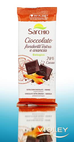 Sarchio Cioccolato Fondente Extra e Arancia, senza glutine. Eine Schokolade für Feinschmecker und Liebhaber intensiver Aromen. Der kräftige Geschmack des Kakaos unterstreicht die Zitrusnote der Orange und sorgt für ein unvergessliches Geschmackserlebnis.