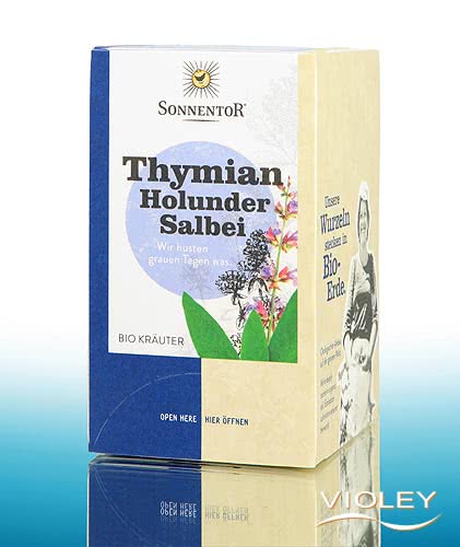 Sonnentor Thymian Holunder Salbei. Speziell in der nasskalten Zeit sollte dieses Trio in jedem Teeschrank zu finden sein - wie früher bei Oma! Der Frosch im Hals sucht beim Anblick von Thymian und Salbei freiwillig das Weite. Thymian sorgt mit seinem krautig-süßlichen Geschmach für wohlige Wärme, wenn es Sie einmal fröstelt.