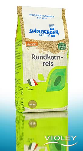 Spielberger Rundkornreis in der familienfreundlichen 1-kg-Packung. Der Rundkorn-Naturreis wird nur vom unverdaulichen Spelz befreit, das Silberhäutchen bleibt erhalten. Verwenden Sie den Rundkornreis für Reis-Pfannen und -Aufläufe. Rundkornreis schmeckt auch in süßen Gerichten und Nachspeisen.