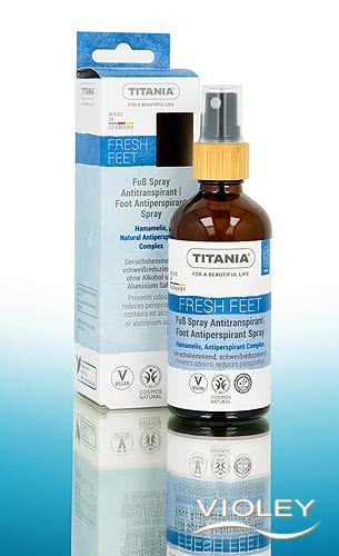 Titania Fresh Feet Fuß Spray Antitranspirant. Erfrischt die Füße mit ätherischen Ölen aus Teebaum, Rosmarin und Thymian und hilft, unangenehme Gerüche zu reduzieren. Hamamelis-Blätterextrakt trägt zu einem geklärten, gepflegten Hautbild bei. Der enthaltene Pflegekomplex mit Schachtelhalmextrakt und Salbeiöl unterstützt ein angenehm trockenes und frisches Hautgefühl. Ein großartiger Begleiter für den Alltag oder nach dem Sport.