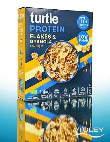 Turtle Protein Flakes & Granola. Für dieses Power-Frühstück werden Mehrkornflocken mit Protein-Granola und Proteinbällchen aus Erbsenprotein gemischt. Kürbiskerne, Sonnenblumenkerne und Leinsamen runden den Geschmack ab. Genießen Sie diese köstliche Mischung mit Milch oder Pflanzendrink zum Frühstück oder zwischendurch.