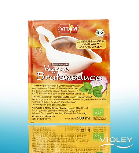 Vitam Vegane Bratensauce. Herzhafte, dunkle Bratensauce mit Maisstärke, Johannisbrotkernmehl, Bratzwiebeln, Karamell und Hefeextrakt. Schmeckt zu Gemüse, Nudeln, Bratlingen oder Kartoffeln.