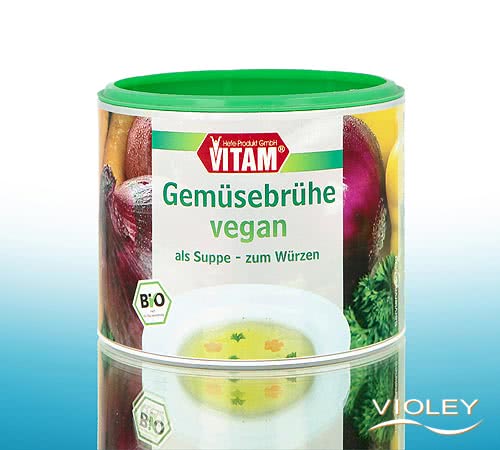 Vitam Gemüsebrühe vegan. Rein vegetarische Bouillon mit dem feinen Geschmack von ausgesuchtem Bio-Gemüse wie Möhren, Pastinaken, Zwiebeln, Paprika und Tomaten. Sie verfeinert Speisen, ist aber auch eine gute Basis für Suppen oder kalorienarme Trinkbouillons.