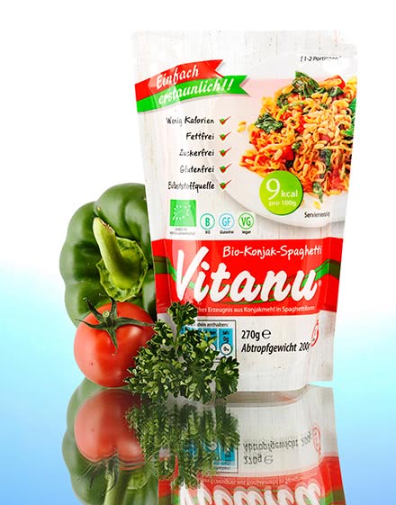 Vitanu Konjak Nudeln werden ebenso wie Konjak Reis aus der pflanzlichen Faser der japanischen Konjak-Wurzel hergestellt. Deren Ballaststoff ist einzigartig und wird schon seit mehr als hundert Jahren in japanischen Küchen verwendet. Konjak Nudeln enthalten nur 9 kcal pro 100 g, der Reis sogar nur 7 kcal pro 100 g. Vitanu Nudeln und Vitanu Reis sind geschmacksneutral, nehmen jedoch den Geschmack der Sauce, des Gemüses oder der Kräuter auf, die hinzugefügt werden. Auf diese Art können Sie - auch ohne strenge Diät - ganz einfach Kalorien einsparen. Sie müssen dazu einfach nur die herkömmlichen Nudel- und Reisprodukte durch Vitanu Konjak Nudeln oder Vitanu Konjak Reis ersetzen.