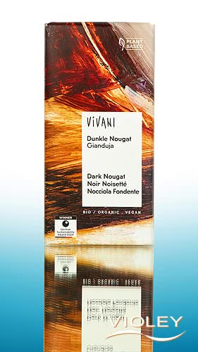 Vivani Dunkle Nougat Gianduja. Eine dunkle Verführung aus feinster Bitterschokolade und zartem Gianduja Nougat mit hohem Haselnussanteil. Durch den Verzicht auf Kuhmilch in der Rezeptur und der ausgeprägten Nougat-Note ist diese hochfeine Schöpfung auch für Veganer ein unbeschreiblicher Genuss.