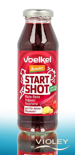 Voelkel Start Shot. Bio Rote Beete Saft milchsauer vergoren mit Ingwersaft, Mehrfruchtsaft und Guarana. Powerkick für den Tag und natürlicher Booster vor dem Sport: Der Start Shot unterstützt die Muskeln mit reichlich Kalium und den Start in den Tag mit natürlichem Vitamin C und Koffein*.