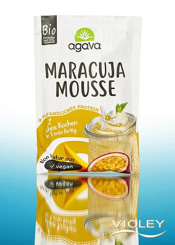 Agava Organic Passion Fruit Mousse. Dessert powder for preparing passion fruit mousse. Tropical-flavoured indulgence with extra protein to spoon up. Quick to prepare and absolutely sure to succeed: stir, mix and enjoy.