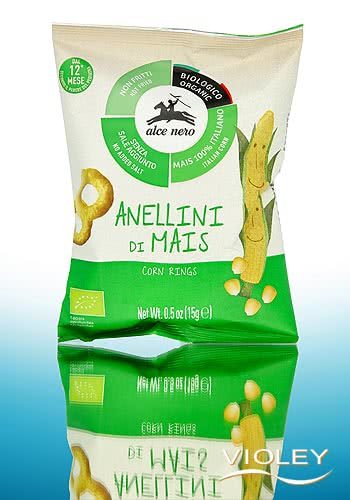 Alce Nero Oragnic Corn Rings. These round snacks are made primarily from corn grown by Italian organic farmers. The light, crispy corn rings are gently oven-baked, not fried. With no added salt (ingredients contain naturally occurring salt), they make a good snack for on-the-go or between meals. Suitable from 12 months.
