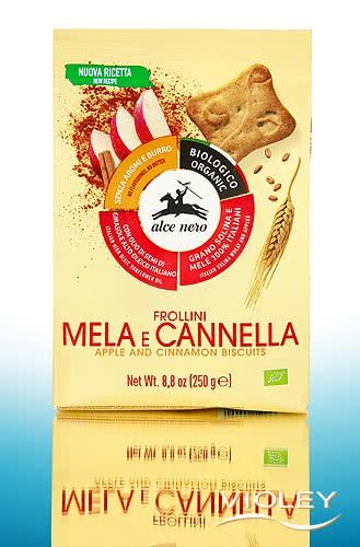 Alce Nero Organic Apple Cinnamon Biscuits. Flavoured biscuits with apple and cinnamon made from Italian Solina wheat, an ancient wheat variety with a special character. The recipe does not contain any eggs or butter, while cinnamon and apple pieces provide a spicy, fruity flavour. Ideal for breakfast, with coffee or for an enjoyable break in between.