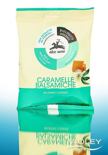 Alce Nero Organic Balsamic Candies. Hard on the outside, soft on the inside and with a pleasantly fresh, balsamic aroma. These sweets combine Italian honey, propolis and eucalyptus essential oil to create a classic combination that simply tastes good.