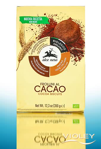 Alce Nero Organic Cocoa Biscuits. Chocolatey cocoa biscuits with an intense flavour, a delight for all lovers of dark chocolate. Baked with Italian wheat flour, the simple recipe contains no eggs or animal fats. A delicious snack for between meals, in the evening on the sofa or on the go.