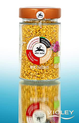 Alce Nero Organic Flower Pollen. From yellow to black ranges the colour palette of this pollen - fine flower dust that bees collect and form into small granules. This flower pollen from Italy can be consumed pure or used to refine yoghurt, fruit juices, milk or lukewarm beverages. Thanks to its floral aroma, it is also suitable for creative recipes.