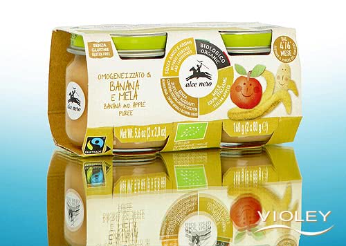 Alce Nero Organic Fruit Puree Banana and Apple. In these jars, aromatic bananas meet apples from Italian organic farmers. The fruit is washed, carefully chopped and then gently cooked into a fine purée. After filling, the jars undergo heat treatment to support shelf life. No added sugar. Contains naturally occurring sugars. This allows children to experience the taste of the fruit in its original character. Suitable from 6 months onwards.