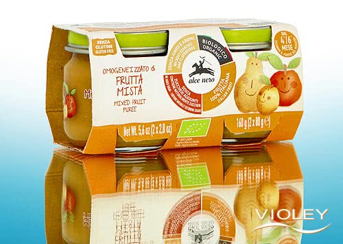 Alce Nero Organic Fruit Puree Mix. A fruity trio of apples, pears and plums from organic Italian farmers. After harvesting, the fruit is washed, chopped and then cooked into a fine puree. The bottled jars undergo heat treatment to extend their shelf life. No added sugar (ingredients naturally contain sugar). This allows children to get to know the flavour of the fruit as intact as possible. Suitable from 6 months.