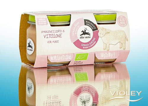 Alce Nero Organic Meat Preparation Veal. The recipe is oil-free so that children can get to know the flavour of the meat as intact as possible. Veal is finely minced and homogenised so that it is easy to swallow. After filling, the jars are heat-treated to extend their shelf life. Suitable from 6 months of age.