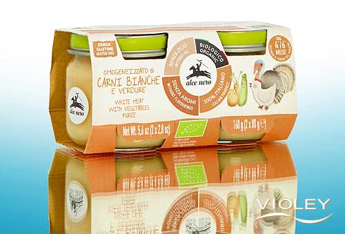 Alce Nero Organic Meat Preparation White Meat and Vegetables. A blend of puréed chicken and turkey with vegetables from Italian organic farmers. All ingredients are finely minced and homogenized. The recipe contains no added oil so that children can experience the original taste of the ingredients. Suitable from 6 months.