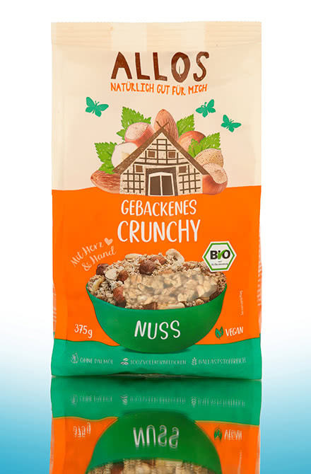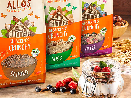 The finely flavoured Allos Baked Crunchy Oats contain a balanced mix of crispy oat crunchies and crunchy rice crispies. Allos Baked Crunchy Chocolate makes the heart of big and small chocolate fans beat faster with melt-in-the-mouth chocolate chips and finely rolled oat flakes. Crunchy roasted hazelnuts and hearty dark chocolate ensure an intense indulging experience in Allos Baked Crunchy Dark Hazelnut. Those who like it fruity should try the Allos Baked Crunchy Berry. With a pleasantly tart-sweet mix of blackcurrants, blueberries, cranberries and crunchy oats, you'll get a good start to the day. Allos Baked Crunchy enriches the breakfast table with crunchy wholemeal oats, fruity berries through to delicious chocolate and roasted hazelnuts.