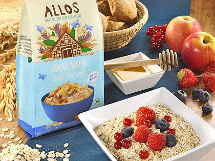 With wholemeal oat flakes, the unsweetened fig and raspberry porridge provides a good start to the day. Figs, sultanas, raspberries and apples give the porridge a fruity flavour. While the unsweetened 3-grain porridge scores highly with wholemeal oat flakes, wholemeal spelt flakes and wholemeal purple wheat groats, you can enjoy the basic amaranth porridge on its own or with a variety of toppings. The recipes for the tasty Allos porridges are based on wholesome organic ingredients. Try the savoury tip with warm frothed milk. Enjoy your meal.