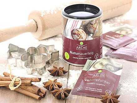 With the Arche Weinstein Baking Powder both easy and more complicated doughs will succeed. It is perfect for Christmas cookies, Sunday cakes and other delicacies. With the natural vanilla sugar you give cookies and other pastries a magnificent vanilla aroma. The Arche Vanilla Sugar convinces with a perfect mixture of finely ground Bourbon vanilla and raw cane sugar. Of course it is also suitable for refining cream and sweet cream fillings. Arche Rice Malt with Barley gives your pastries a down-to-earth sweetness. Whether it is in gingerbread or in almond muffin, the brown syrup enriches your creations with a caramel-like flavor. For those who even want to bake something hearty in addition to the many sweet treats, there is the Arche Natural Sourdough. It supports the aroma of deliciously fluffy breads, rolls and baguettes. And they do taste in any season!