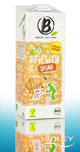 Berief Organic Peach Drink with Oats and Soya. A plant-based drink with a fermented oat and soya base, flavoured with peach puree. Whether at home or on the go: the fruity-sweet flavour brings a summery note to every cup. Also suitable for frothing.