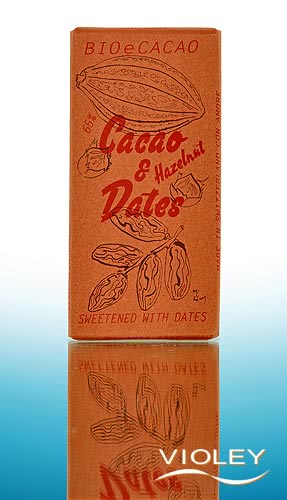 BioeCacao Organic Bar Cacao & Dates Hazelnut. In this bar, intense cocoa flavour meets delicious hazelnuts. A duo to melt in your mouth. The flavour is harmoniously rounded off with vanilla pods and the natural sweetness of dates. With no added sugar¹, this bar is sweetened exclusively with dates.