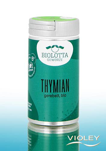 Biolotta Organic Thyme, rubbed in a shaker. Transform your kitchen into a Mediterranean oasis. Rubbed thyme is well suited for pizza, soups or vegetable dishes. Bring sun-kissed flavour to your plate. Combine thyme with olive oil and garlic for a simple but aromatic marinade that will enhance any vegetables or meat in an instant.