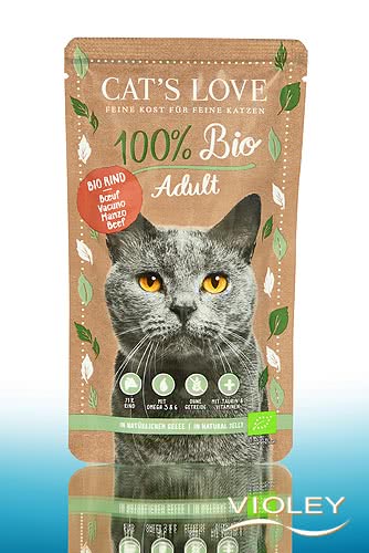 Cat's Love Cat Food Adult Organic Beef. Embedded in natural jelly, fine pieces of organic beef await your cat in this adult cat food. Grain-free, but with a high meat content, the menu is a real treat for your little gourmet.