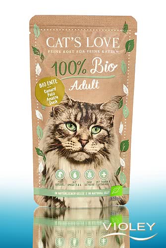 Cat's Love Cat Food Adult Organic Duck. Embedded in natural jelly, fine pieces of organic duck await your cat in this adult cat food. Grain-free, but with a high meat content, the menu is a real treat for your little gourmet.