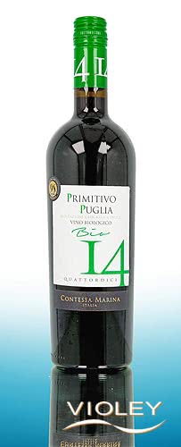 Contessa Marina Quattordici 14 Organic Primitivo Puglia IGT. The southern Italian region of Puglia offers perfect conditions for the production of outstanding wines, which is perfectly reflected in this fruity, full-bodied Primitivo. It is matured for four months in French oak barrels. The result: a semi-dry, powerful red wine with an intense colour, soft structure and pronounced fruit. It has an intense ruby red colour in the glass. Fruity aromas of ripe cherries and plums unfold on the nose. On the palate, the wine is full-bodied, velvety and soft, with a long, harmonious finish.