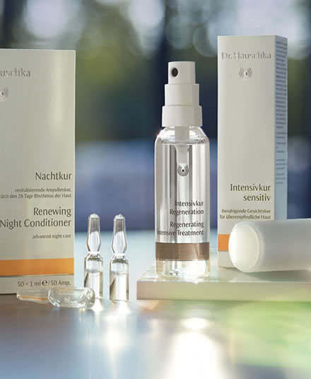 Over a 28 day period the skin cells renew. According to this regeneration rhythm the Renewing Night Conditioner should be uses as a 28-day treatment instead of the basic night care. Per ten years of one’s life Dr. Hauschka recommends one cure per year, for example, at the age of 30 it would be three times a year. After the cleansing apply the content of 2 ampoules to the face (including the lip and eye area), neck, earlobes and the décolleté. In the 4th week only one ampoule is sufficient. As a complementary night care Dr. Hauschka recommends the Night Serum or the Regeneration Serum. For a refreshed start to the day.