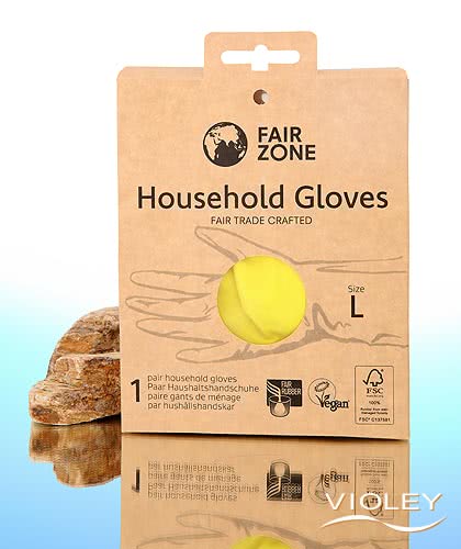 Fair Zone Household Gloves Natural Latex, Size L. The pack contains a pair of yellow household gloves. These are made of fair-traded natural latex. Suitable for all household tasks such as dishwashing or cleaning. Also usable for gardening work.