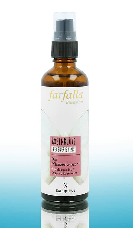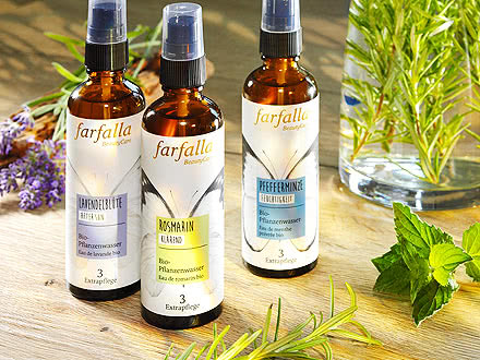 The Hydrosols organic by Farfalla are not only suitable for facial and hair care. They also support aroma care. The precious Hydrosols organic without alcohol are available in different varieties. The Hydrosol Rose Blossom organic won by the distillation of valuable Damask roses is particularly popular as a daily facial toner, but also as a beguiling laundry scent or as the basis of natural perfumes. Do you like a freshness kick in between? Then the Hydrosol Peppermint organic is the right thing for you. It is revitalizing and cools face and décolleté in a pleasant way. The Hydrosol Orange Blossom organic is particularly special as well. Orange blossom water has a subtle fruity scent and soothes mature facial skin as well as skin that tends to dryness. The plant water from the freshly picked blossoms of the bitter orange tree is also suitable in order to mix your own perfume creations. Combination skin and impure skin look forward to the cleansing properties of the Hydrosol Tea Tree organic and the Hydrosol Hamamelis organic. With the Farfalla Hydrosols organic you can discover the manifold application possibilities of pure plant power.