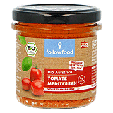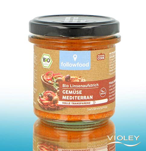 Followfood Organic Lentil Spread Mediterranean Vegetables. In this plant-based spread with lentils, red peppers, tomatoes, courgettes, aubergine, oregano, thyme and rosemary provide the Mediterranean flavour. A real treat on bread, rolls or baguettes.
