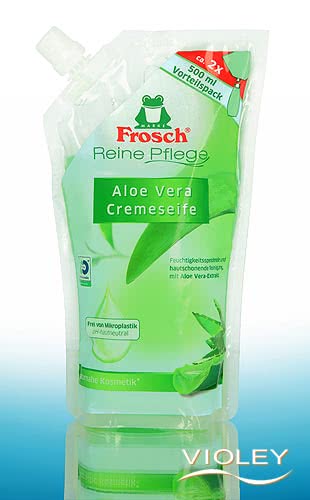 Frosch Aloe Vera Creme Soap in the practical 500 ml refill pack. The formula with aloe vera extract and other selected ingredients ensures gentle cleansing every time you wash your hands.