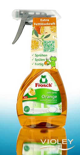 Frosch Dishwashing Spray Orange. Degreases and cleans dishes, pots and pans to a sparkling clean. The powerful formula with orange extracts removes grease and stubborn encrustations. Sprayed on directly, the spray is pleasant and easy to apply.