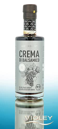 Ghorban Organic Crema Di Balsamico. The secret of the excellent flavour is the addition of matured balsamic vinegar to the cooked grape must. The thick Crema di Balsamico refines every salad and carpaccio. It is also a highlight as a topping on fruit and ice cream, and raspberry with a drop of Crema di Balsamico is a favourite between courses.