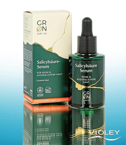 GRN Salicylic Acid Serum. For oily, blemished skin. Salicylic acid, a BHA (beta hydroxy acid), gently removes dead skin cells, while the organic willow bark extract it contains has soothing properties. Lemon myrtle extract helps to even out skin tone and reduce excess shine. For purer skin in balance.