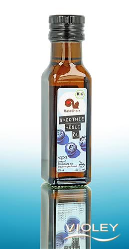 HaselHerz Organic Smoothie Muesli Oil. Carefully balanced vegetable oil blend with 45% cold-pressed linseed oil and a fine blueberry flavour. The combination of gently pressed linseed oil and mild rapeseed oil gives muesli, smoothies, bowls or yoghurt an aromatic, fruity and nutty note. For an enjoyable extra portion of omega-3 fatty acid.