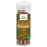 Herbaria Organic Cumin whole in the glass shaker. Cumin blends well with other exotic spices. For oriental dishes such as hummus and falafel. With its aromatic flavour, cumin also goes well with also goes well with Indian and Asian dishes such as chutneys, couscous, stews or chilli con carne.