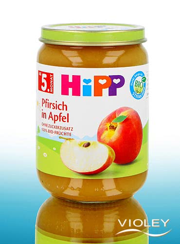 Hipp Organic Peach in Apple. Juicy apples and sweet peaches give this organic fruit preparation its wonderfully fruity aroma. How to eat it: From the 5th month as a dessert or an ingredient in porridge.