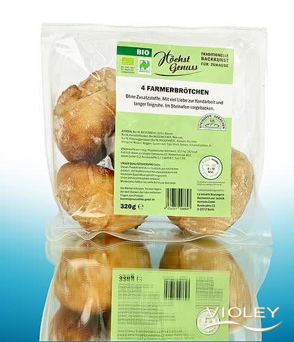 Höchst Genuss 4 Farmer's Bread Rolls. Made with a lot of love for handcraft and long dough resting times and pre-baked in a stone oven. The flavoursome rolls are quickly baked and a highlight on the breakfast table. They taste great with a savoury topping or with sweet spreads.